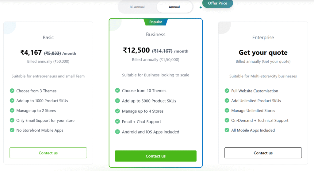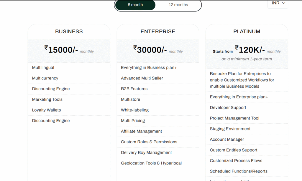 | StoreHippo | Business ₹15,000/month | Enterprise ₹30,000/month | Platinum from ₹120,000/month | Annual term typically required; taxes extra |