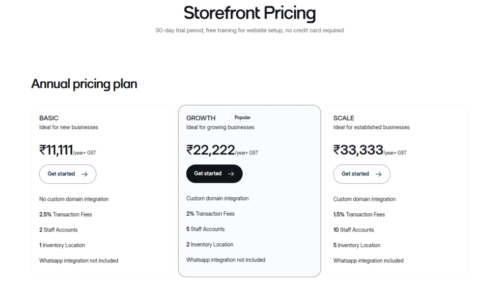 - Storefront pricing: Annual plans commonly listed at ₹11,111/year, ₹22,222/year, and ₹33,333/year (plus GST) with decreasing transaction fees of 2.5%, 2%, and 1.5% respectively; check the live pricing page for the latest.