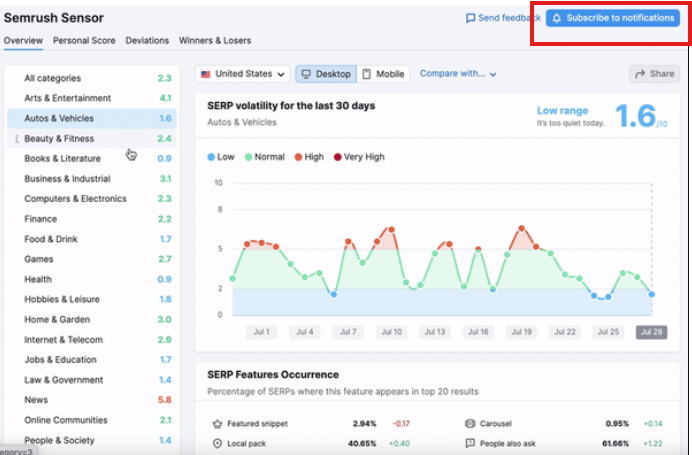With the Semrush Sensor, you can easily toggle between desktop and mobile volatility scores. This is incredibly important because Google often rolls out changes that affect mobile and desktop results differently. If you notice a drop in mobile traffic, you can check the mobile-specific score to see if it’s part of a broader mobile SERP shake-up.