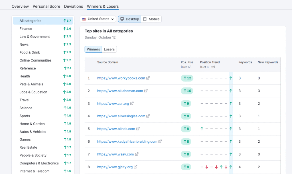 Knowing that volatility is high is one thing, but knowing who is benefiting from it—and who isn’t—is where you can find truly actionable insights. The Semrush Sensor provides this information through its “Winners and Losers” feature.